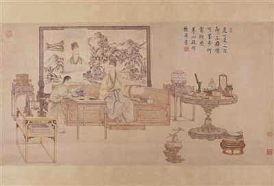 和画中的弘历一样,画上的家具器物,也都是写实的,例如摆满古物的那张圆桌,即为北京故宫博物院院藏6000余件明清宫廷家具收藏账目中的“朱漆描金花卉纹葵式桌”,与院藏大部分明清家具一样,它不仅是当时最高工艺水准的艺术品,同时更可与详尽的文献资料相互印证,是存储着使用者生命痕迹和历史记忆的载体。(杨道 辑)