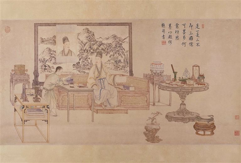 此时的乾隆皇帝年逾不惑,身着汉家衣冠舒适地坐在榻上,身后悬挂着一幅与他画中容颜一致的肖像,周围遍布其所珍爱的器物。乾隆皇帝为这幅作品题写了佛家偈语: