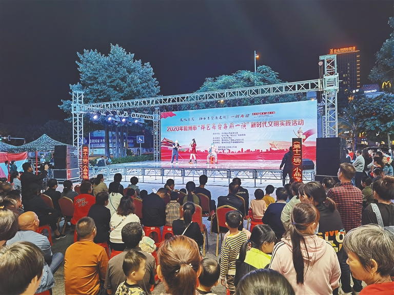 11月20日晚8时,“群艺舞台每周一演”儋州调声、山歌专场演出活动,在儋州市那大镇夏日国际商业广场开始,传统的儋州调声节目《嘱姑九点半》、儋州山歌《贺歌》;时代气息浓郁的山歌小品《脱贫》、儋州调声《调声欢唱新时代》等节目,吸引了500多名市民到场观看。市民林秀兰带着66岁的母亲观看演出:“我们几乎每场演出都来,节目雅俗共赏,娱乐性强,丰富了市民文化生活。”