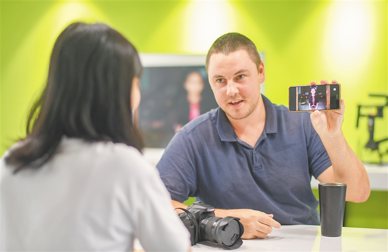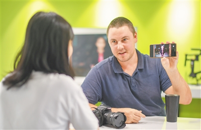 海口复兴城,热带海南英文网的工作人员和客户在交流沟通。 本报记者 袁琛 摄
