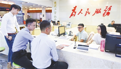 在海南省人民政府政务服务中心审批服务综合窗口,工作人员在解答企业人员的咨询并受理所交的材料。本报记者 张茂 摄