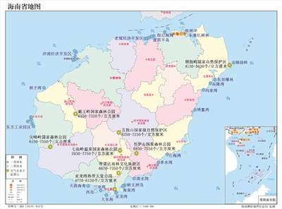 主要森林旅游区空气负离子浓度处于较高水平,霸王岭、尖峰岭、五指山、七仙岭、铜鼓岭、亚龙湾、吊罗山、呀诺达8个主要森林旅游区空气负离子平均浓度分别为6850个/cm3、6825个/cm3、6760个/cm3、6680个/cm3、4810个/cm3、5540个/cm3、7200个/cm3、7060个/cm3,远超过世界卫生组织规定清新空气1000~1500个/cm3 的标准,对人体健康极有利。
