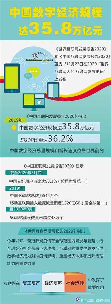 新华社杭州11月23日电(记者高亢 许舜达)《世界互联网发展报告2020》和《中国互联网发展报告2020》蓝皮书23日在2020“世界互联网大会·互联网发展论坛”上发布。《中国互联网发展报告2020》指出,2019年,中国数字经济规模达35.8万亿元,占GDP比重达36.2%,中国数字经济总量规模和增长速度位居世界前列。