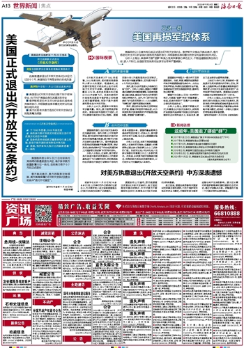 对美方执意退出《开放天空条约》 中方深表遗憾