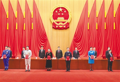 在欢快的乐曲声中,全国劳动模范和先进工作者代表依次登上主席台,习近平等为他们颁发荣誉证书。