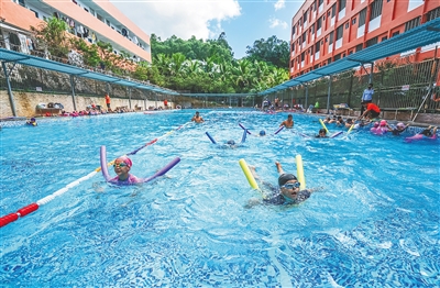 11月23日,在三亚海南鲁迅中学游泳池,小学生们正在进行游泳培训。自2018年暑期以来,三亚全面开展普及中小学生游泳教育。截至目前,今年该市各中小学校共有7843人完成游泳培训,4800余人考核达标。本报记者 武威 摄