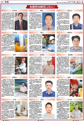 杨全文,万宁市龙滚镇人,海南派成铝业科技有限公司车间主任。2017年以来,杨全文屡获“海南省最美农民工”“海南省工人先锋号”“海南省劳动模范”等荣誉称号。