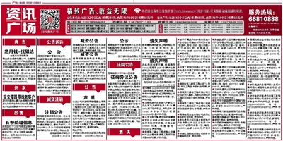 ●田华宇不慎遗失中南西海岸B11-203收款收据2张,编号:NO15.0012569,金额253810元;NO15.0012504,金额:10000元,声明作废。