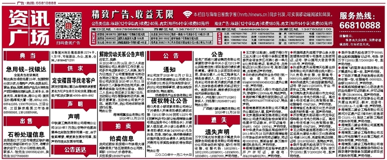 本公司定于2020年12月17日上午9点在洋浦港物业公司商住小区四栋202房召开全体股东会议,决议公司注销等事项,请全体股东按时参加,特此通知。