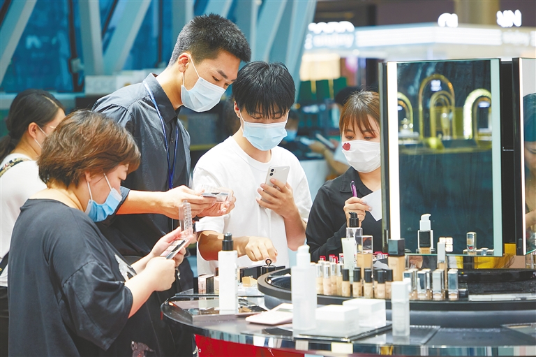 今年国庆中秋黄金周期间,游客在三亚国际免税城购物。