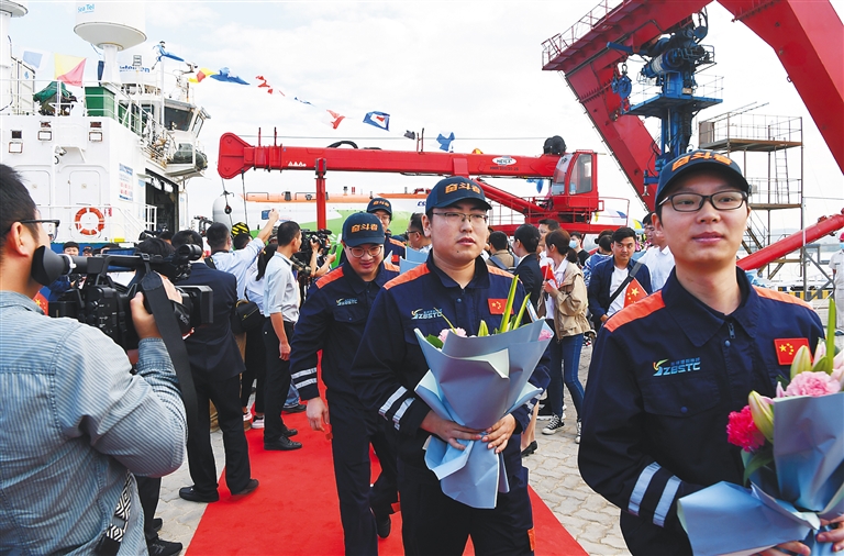 28日8时30分许,一阵汽笛声响,创造了10909米中国载人深潜新纪录的“奋斗者”号,完成第二阶段海试,胜利返航。