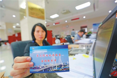 ① 在洋浦经济开发区政务服务中心,服务窗口的工作人员展示专为服务企业、项目准备的“重点项目代办服务咨询联系卡”。