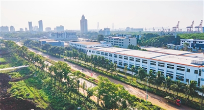 ② 洋浦经济开发区保税港区楼房外立面已焕然一新、大道的右侧数十间粮油仓库已完工交付使用,一片欣欣向荣的景象。