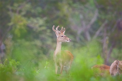因栖居于丘陵坡地而得名的海南坡鹿,外形颇似梅花鹿,但体形较小、花斑较少,且颈、躯体和四肢更为细长。更为特别的是,海南坡鹿雄性的角都有一个大而弯的眉杈,和弯曲的主枝接连起来,几乎呈弯弓状,让它又多出“眉杈鹿”“眉角鹿”的别称。