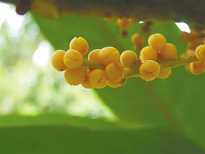 锈色的星状绒毛密布在棕褐色的幼小枝条上,大面积的花团映入眼帘,原来是鸡蛋黄颜色的密集小花簇拥在一起。和高大浓绿的树形不同,海南风吹楠的枝头甚至可以称得上秀美可爱。但观赏价值如此高的庭园绿化树种,却是海南岛的极小种群植物之一。
