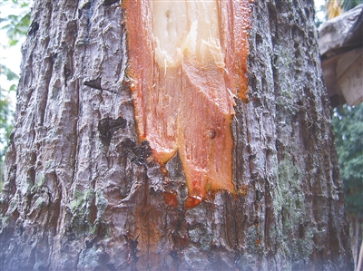轻轻划破坚硬的树皮,渗出的暗红色“血液”沿着“伤口”滑落,而这让人触目惊心的景象,其实是风吹楠茎干分泌出的树脂。