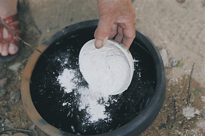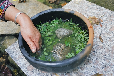 摘下五六十斤新鲜假蓝靛叶子,放入清水没过叶面,盖上盖子,然后在阳光下浸泡、暴晒一个月。年过花甲的羊玉兰干起活来,动作还很麻利,尽管工序复杂,耗时较长,但她仍然乐在其中。如今,造靛的主要原材料植物假蓝靛已十分稀缺,要上山苦苦寻来,不像有些地方可以广泛种植,因此她总是小心地计算着用量,生怕浪费了一点一滴。