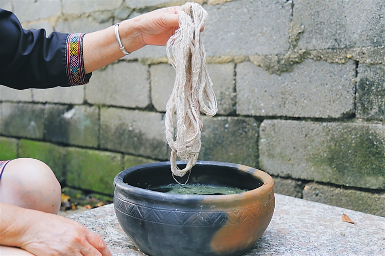 上山采摘染料植物,浸泡一个月,将棉线入染……经历近10个步骤的复杂工艺终得一捆,这是昌江黎族自治县石碌镇保突村羊玉兰的家传技艺——手工染线。