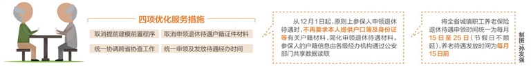 本报海口11月30日讯 (记者李磊)海南日报记者11月30日从省社会保险服务中心(医疗保险服务中心)获悉,12月1日起,该中心在全省经办机构推出取消提前建模前置程序、取消申领退休待遇户籍证件材料、统一协调跨省协查工作、统一申领及发放待遇经办时间等四项优化服务措施,方便职工申领退休待遇。