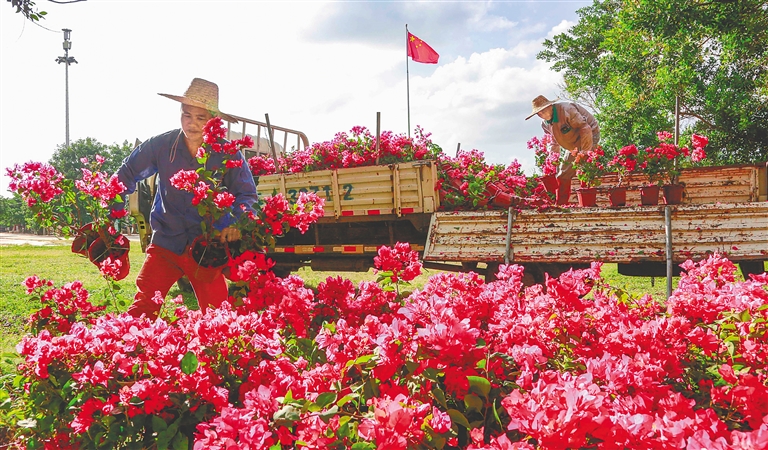 近日,在昌江黎族自治县海尾镇三联村,工作人员将扶贫三角梅运来装扮村庄,助力美丽乡村建设。