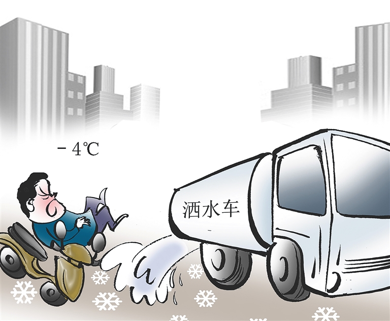 洒水车冬季作业要科学精准操作,其前提是要为群众的安全负责。而在零下4℃的天气里洒水,肯定会导致路面结冰,给过往行人造成不便,甚至造成交通事故。这一点,恐怕相关部门不会想不到,只是急于完成工作的惯性蒙蔽了正常的思维,而忽略了群众的出行需求。这说到底,还是形式主义的工作作风在作祟。城市的形象、吸引力和亲和力,不仅要靠环境卫生,更应靠其它各种人性化的软环境。这就要求管理者把群众的利益和安全放在心上,执行各项政策、措施时做到人性化、精细化、精准化管理,科学调配,统筹安排,别再闹出“洒水结冰”的事故和笑话。(图/陶小莫 文/魏燕)