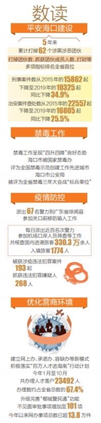 五年来,海口全市公安机关深入推进扫黑除恶专项斗争,累计打掉62个涉黑涉恶团伙,打掉的团伙数、抓获团伙成员人数、打财等多项指标排名全省首位,其中打掉11个涉黑组织。开展禁毒三年大会战,禁毒工作呈现“四升四降”的良好态势,海口市被国家禁毒办评为全国禁毒示范创建工作先进城市,海口市公安局被评为全省禁毒三年大会战“标兵单位”。始终保持对黄赌、入室盗窃、“两抢”、电信网络诈骗等违法犯罪行为的严打高压态势,刑事案件数从2015年的15862起下降至2019年的10325起,同比下降34.9%,治安案件查处数从2015年的22557起下降至2019年的16805起,同比下降25.5%;其中八类严重暴力案件、盗窃、“两抢”等案件同比均明显下降,社会治安状况处于近年来最好水平。