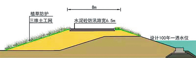海口江东新区地处南渡江尾闾,地势平坦。南渡江右岸堤防承担着江东新区的防洪安全保护任务,但现状堤防防洪标准为30年一遇,已不能满足如今的现实需求。按照100年一遇防洪标准,绕城高速以下段现状堤防超高不足,尤其是海瑞大桥以下至麻余村段右堤超高不足问题尤为突出。“南渡江右岸堤防等级为3级,堤顶高于100年一遇洪水位0.7米至1.2米,不满足堤顶超高1.55米的要求,堤顶宽度为6米,由于右岸江东新区的规划建设,防洪标准提升到100年一遇,相应堤防工程等级应提高到1级。”海口市堤防工程建设管理中心项目技术负责人王绵珊说:“现在我们在抓紧建设南渡江右岸堤防改造工程这个项目,保障江东新区的防洪安全,预计年底之前完工。同时,在施工过程中考虑南渡江沿线绿色生态景观空间的建设要求,为后续建设景观工程打好基础。”