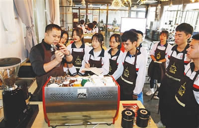 “咖啡专业开设之初,面临着无专业教材可用的难题,老师们下基地、跑行业,自主开发了校本专业课程。”该校咖啡专业教师李丽芬介绍,目前学校建有两间咖啡实训室和10亩校外咖啡种植基地,课程教学涵盖了咖啡种植、加工制作全过程。