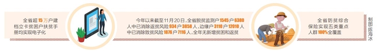 此外,全省范围还启动开展了防贫综合保险,实现包含边缘人口在内的五类重点人群100%全覆盖,其他农村人口覆盖率达到92%。截至11月20日,全省脱贫监测户1545户6380人中已消除返贫风险934户3858人,边缘户3110户12010人中已消除致贫风险1876户7116人,全年以来无新增贫困人口和返贫现象。