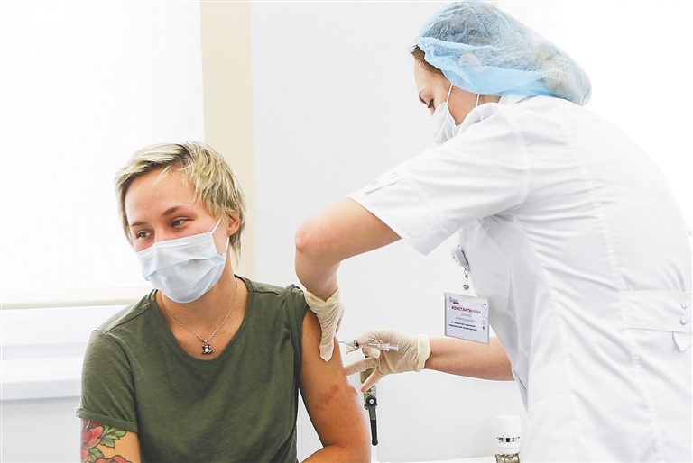 俄罗斯莫斯科市政府市民新冠疫苗接种电子申请系统4日正式启动,接种站5日开始工作。俄工业和贸易部透露,近期俄疫苗产量将达200万剂。图为在莫斯科,医护人员为申请者接种新冠疫苗。