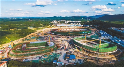 近日,俯瞰儋州市体育中心“一场两馆”项目建设现场,“一场两馆”雏形初现。