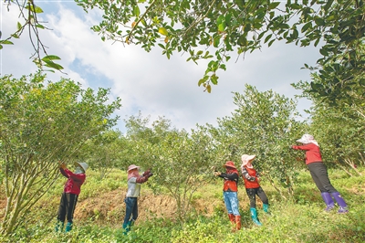 而在琼海市嘉积镇温泉村,脱贫户王欢庆现在每天的工作,就是在自家的油茶地里采摘油茶果。油茶业是琼海的特色农业产业,2018年琼海油茶通过农业农村部农产品地理标志登记专家评审,国家油茶科学中心热带试验站也在琼海设立。当地返乡青年王辉浩看好油茶产业的发展前景,发挥所长,开始在温泉村带动村民规模化种植油茶树。