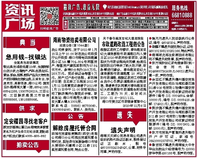 我公司受委托,定于2021年1月15日上午10:00时在我公司拍卖厅公开拍卖:海口市海甸四东路富苑小区3A幢704、804号两套房产,每套房产建筑面积均为37.84平方米。参考价分别为29.5万元、28.5万元。竞买保证金每套5万元。房产过户各付各税。标的展示日期:自见报之日起至2021年1月12日有意竞买者请于2021年1月13日中午12:00时前到我公司了解详情并办理竞买手续。联系地址:海口市海秀大道33号瑞宏大厦A幢A1003房。