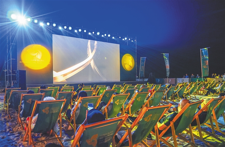 12月7日晚,在三亚大东海沙滩上,观众在观看第三届海南岛国际电影节展映影片《无尽之夏》(以冲浪为主题的体育纪录片)。本届电影节期间,海南岛国际电影节组委会在三亚海棠湾保利瑰丽酒店草坪、大东海沙滩放映多场露天电影,带给影迷全新体验。本报记者 武威 摄