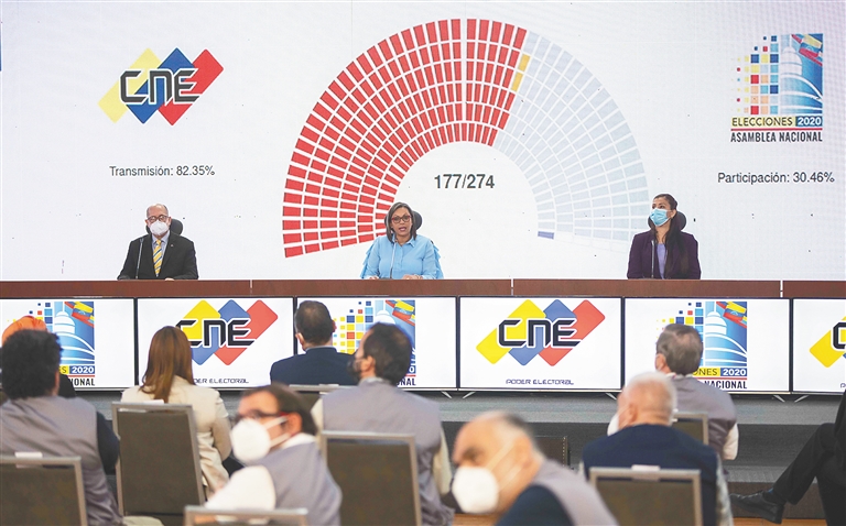 委内瑞拉6日举行议会选举。初步计票结果显示,执政党竞选联盟赢得选举胜利。图为7日凌晨,委内瑞拉国家选举委员会主席英迪拉·阿方索(台上中)正式宣布委议会选举结果。 新华社发(萨尔戈多 摄)