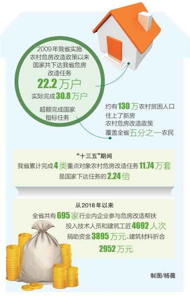 近年来,我省高度重视农村危房改造工作,以建档立卡贫困户、低保户、农村分散供养特困人员、贫困残疾人家庭4类人员为农村危房改造重点对象,全力推进全省农村危房改造工作。据省住房和城乡建设厅统计,“十三五”期间,我省累计完成4类重点对象农村危房改造任务11.74万套,是国家下达任务的2.24倍,我省农村危房改造绩效评价排名也屡次位列全国前茅。