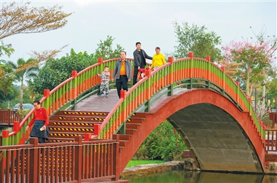 12月7日,附近居民在屯昌县屯城镇文赞湿地公园悠闲散步。