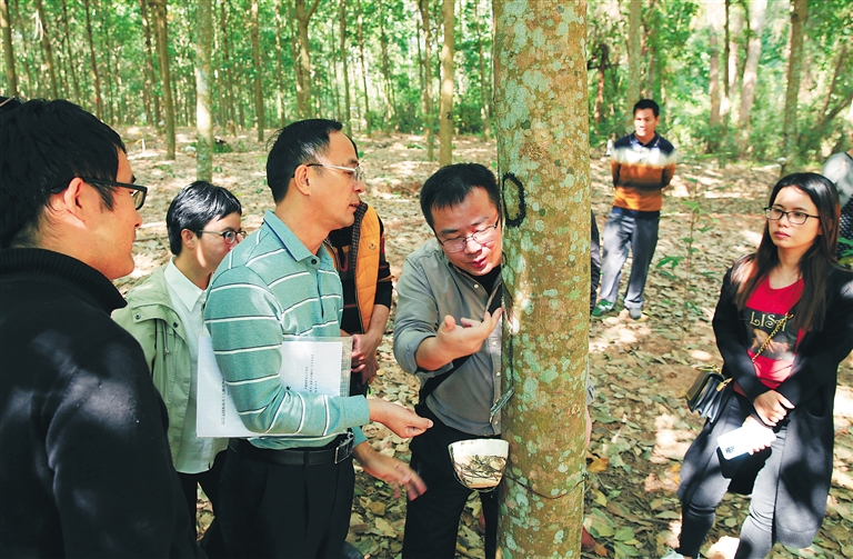 图为与会者在橡胶研究所三队高产示范橡胶园探讨橡胶生产。