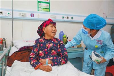 ⬇ 12月8日,在琼中县人民医院,护士为建档立卡贫困户邓美英测量血压。住院治疗结束后,邓美英治疗费用的九成由政府报销。