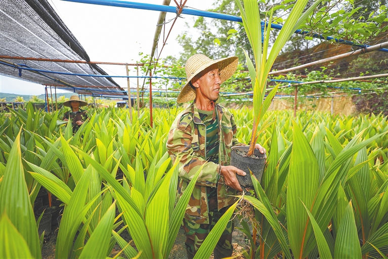“现在我承包管理2000多株金椰子,算下来一个月能赚四五千元工钱,跟着大企业好好干,准没错!”12月8日,农户王丕岁起了个大早,与其他管护工人一起拿着工具来到金椰子种植基地。现今的光景,坚定了他种植金椰子增收致富的信心,大伙都忙乎着除草、施肥等工作,干劲十足。