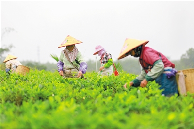 12月10日,在白沙黎族自治县牙叉镇陨石坑旁边的五里路有机茶园,附近村民在采茶。
