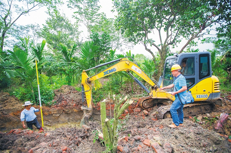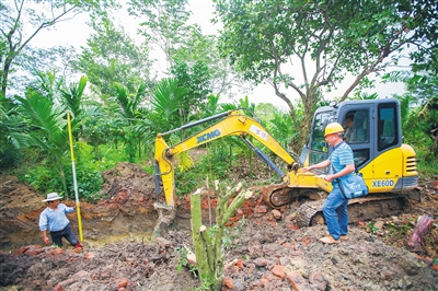 省水务厅投入1320万元帮扶儋州市南丰镇头佑村委会建设美丽家园项目。图为小型挖掘机在挖排水沟。通讯员 罗鑫 摄