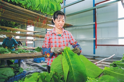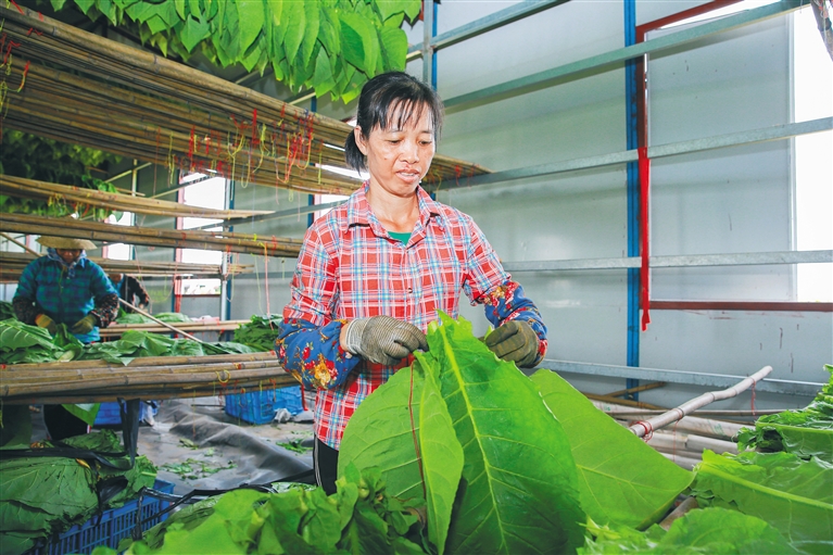 儋州市光村镇雪茄基地带动村民家门口就业。图为村民串架晾晒刚采摘的雪茄烟叶。通讯员 黎有科 摄