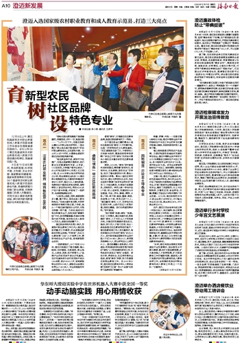 此外,澄迈已在全省率先成立第一所独立法人、独立编制、独立核算的社区教育工作机构——社区教育学院,以及成立5所直属社区学校、1所老年大学、27所镇级社区教育学校、145个村(居)教学点、11所县社区教育研学基地、4所县职业教育实践基地、6所县终身教育工作基地,基本形成以县职校为龙头,省技师学院老城分校、健康职业技术学院为两翼,乡镇、村(居)成人文化学校为基础,研训中心教研网等补充的多级职成教育网络体系。