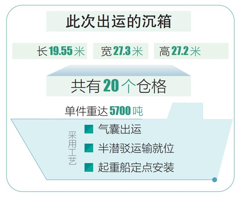 此次出运的沉箱长19.55米,宽27.3米,高27.2米,共有20个仓格,单件重达5700吨,采用气囊出运、半潜驳运输就位、起重船定点安装的工艺。