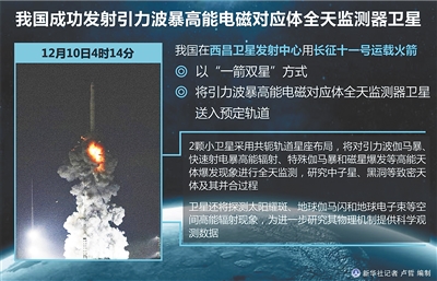 新华社西昌12月10日电 12月10日4时14分,我国在西昌卫星发射中心用长征十一号运载火箭,以“一箭双星”方式将引力波暴高能电磁对应体全天监测器卫星送入预定轨道,发射获得圆满成功。