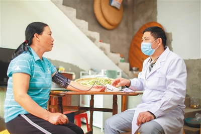 12月9日,昌江黎族自治县王下乡卫生院的家庭签约医生王省金在三派村为脱贫户检查身体。履约服务定期为有慢性病的家庭提供服务。