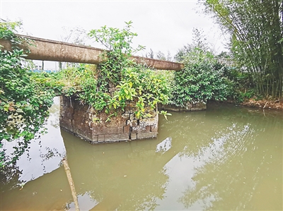 这是一座三孔石板桥,四周已经被菜地包围,除了窄窄的石桥板外,桥两端和两个立在那央河上的桥墩上都长满了杂草。方形石块砌筑而成的桥墩,至今没有变形;长条石板铺设桥面,依旧坚固可以通行。一段20世纪60年代修建的水渠与其并行,基座就安放在古桥墩,同样保存完好,足以证明桥墩厚实耐用。