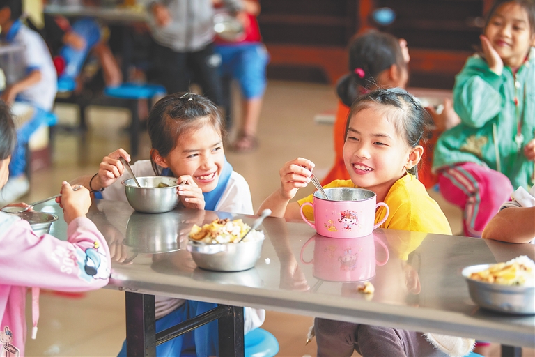 12月10日,在昌江黎族自治县王下乡中心学校,学生们在午饭时间开心闲聊。