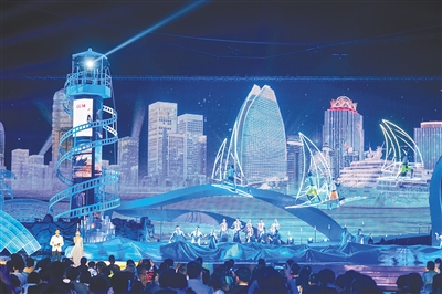 闭幕式的舞台上,白色的飘逸线条如蔚蓝大海上翻腾的海浪,棵棵椰树“迎风”而立,被“电影胶片”缠绕的灯塔在光影变幻间熠熠生辉。